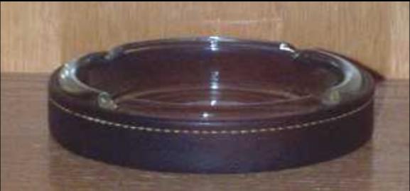 This ashtray is in almost new condition and luxuriously crafted. It is a large ashtray measuring 8.5" across and weighs over 2 pounds. I can see why Jimmy decided to take this one back home with him to Parnell, Missouri on his retirement from Monmouth Park. It is made of a heavy brown leather sleeve with harness stitching around the edge. The bottom has felt padding to protect fine furniture. On the inside of the sleeve is a gold engraving of the gates of Monmouth Park racetrack with Monmouth Park inscribed underneath and showing through the glass ashtray insert. There is a heavy glass ashtray insert that fits into the leather sleeve.
