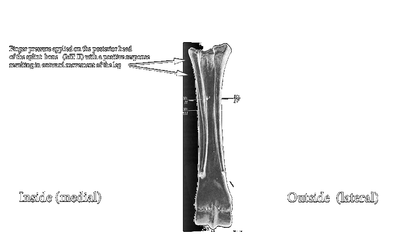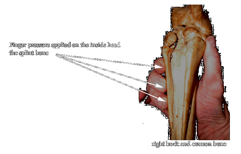 Taking the left hind leg, you should pick it up and with the right hand, hold the flexed hoof in the palm of your right hand. I like to be in a squatting position so that I can rest my right forearm/elbow on my right knee/thigh while doing this examination. This cuts down on the examiners's muscle strain and allows you to concentrate on applying pressure to the inside head of the splint bone with the opposite hand. Ok, with the left leg being supported by your right hand, you take your left hand and place the thumb on the front part of the flexed hock with your index & middle fingers curling around over the inside lower portion of the hock--over the very top portions of the inside splint bone--you then apply intense finger pressure to this part of the splint bone. If the horse is positive for hock soreness, he will attempt to straighten and carry to the outside that hind leg. If he is negative for hock lameness, there will be no response. Repeat on the opposite hind leg, using opposite hands and fingers. I have long ago acquired hock bones from a dead horse to study on my own and know the structure of that joint as intimately as possible. I suggest you should do the same. It helps educate your fingers to what is felt under the skin. Practice on every horse you come across or is in your care!